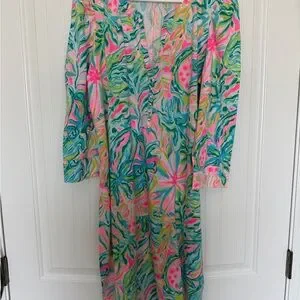 Chic long sleeve dress with vibrant pink and blue patterns. Perfect for any occasion. New with tags. Smoke free home. Sold out on Lilly website!