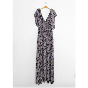 DETAILS: stunning paisley chiffon maxi dress that is perfect for any upcoming spring, summer or fall wedding! Features tied shoulders, v-neck and back, smocked mid section, hidden side zipper and dramatic slit up the side.