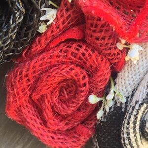 Beautiful handmade buffalo check wreath with red and black burlap flower accents and an arrow through the heart shaped design. Add this to your front door or hang on a wall. it's so adorable.