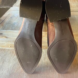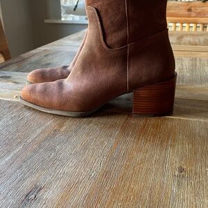 NWOT brown leather knee-high boots. Never worn, only tried on at home. The boots have natural shadings in color and markings that are natural qualities of the leather. Side zipper, almond toe. Beautiful, rich caramel brown color.