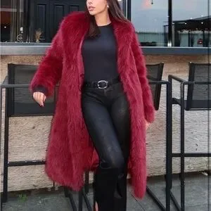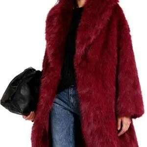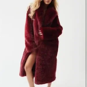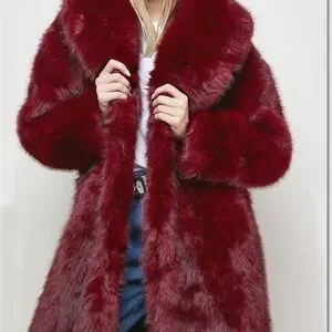 Elegant red faux fur coat. Perfect for a chic look.
