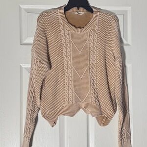 This Adora women's crew neck sweater in size L features a washed khaki knit pattern. The design incorporates vertical cable knit panels on the front and sleeves, alongside textured and chevron-patterned sections. It has a ribbed crew neck, cuffs, and a scalloped hemline. Super trendy