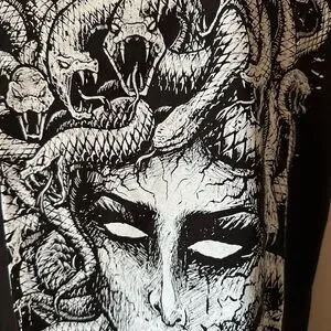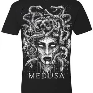 Black t-shirt featuring a striking Medusa graphic in white. Perfect for casual wear.