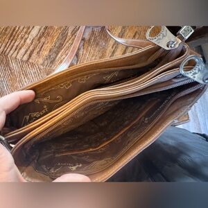 Elegant brown crossbody bag with intricate embellishments. Ideal for any stylish occasion.