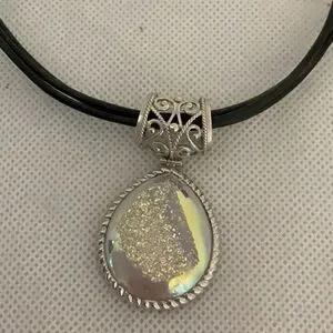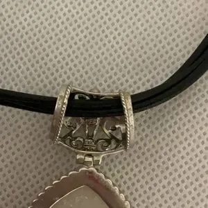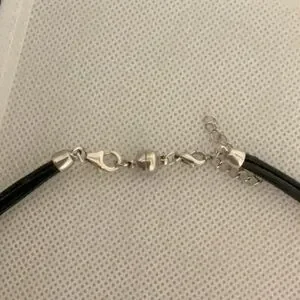 This elegant necklace features a stunning sterling silver and teardrop stone pendant on 3 sleek black cords. Perfect for adding a touch of sophistication to any outfit. It features a magnetic clasp and filigree design. This necklace is in good condition.