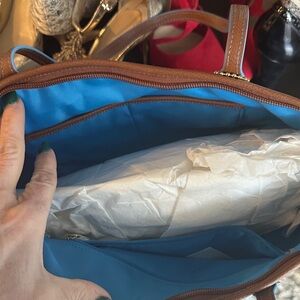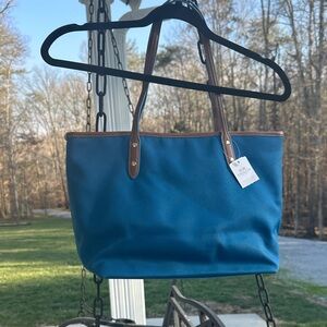 Elegant Coach tote in blue with tan accents. Features a front zipper pocket and spacious interior. Ideal for daily use.