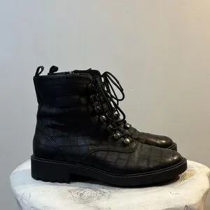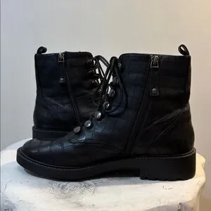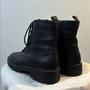 Black Lace Up Combat Style Snake / Croc Reptile Embossed Ankle Boots, size 8