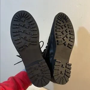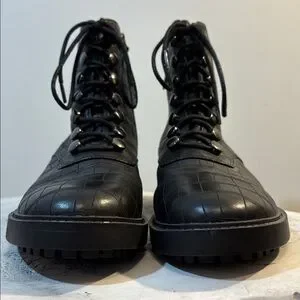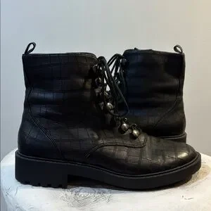 EUC! Snake / croc / alligator style reptile embossed pattern into the black (faux?) leather - seems like a high quality faux leather or a genuine leather (kinda smells genuine!) thin over a soft poly layer. Not super thick/structured the way a thick genuine leather would be. Soft and comfortable to wear! Inside ankle zippers to slide on and off easily once you have the laces how you like them. Combat style post wrap laces. 🖤