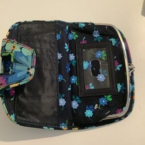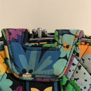 Floral kiss lock wallet with multiple compartments for cards, ID, and coins.