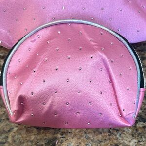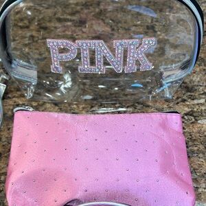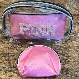 This chic makeup accessory bag set features a clear and pink design, perfect for organizing essentials with flair. Includes a matching pink coin purse for added convenience.