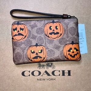 NWT COACH Halloween Corner Zip Wristlet Signature Canvas w Pumpkin Print CCL20