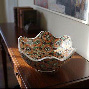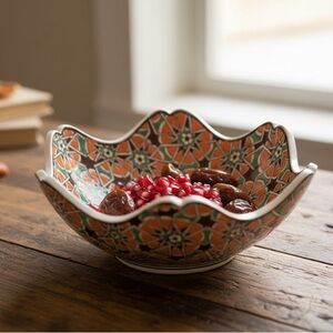 Enhance your home decor with this stunning handcrafted mosaic bowl. Featuring vibrant orange, green, and brown patterns, this piece adds a touch of elegance to any space.