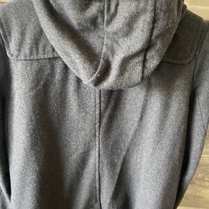 Charcoal coat with toggle closures. Military-inspired design. Perfect for chilly days.