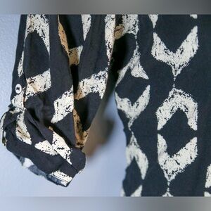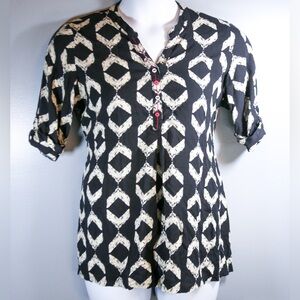 Fusion top, geometric tunic, black white blouse, XXL tunic top, boho top, casual chic blouse, work casual top, lightweight tunic, roll tab sleeve top, patterned blouse, women’s XXL top, relaxed fit tunic