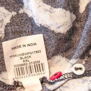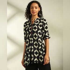 Chic and effortless Fusion tunic top featuring a bold black and ivory geometric print. Designed with a relaxed fit, flattering longer length, and a split neckline with decorative button detail accented by contrast stitching. Lightweight and breathable fabric makes this perfect for everyday wear, travel, or casual workdays.