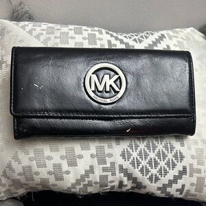 Sleek black leather with embossed Michael Kors logo. Perfect for a chic look.