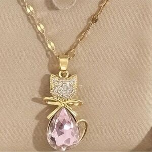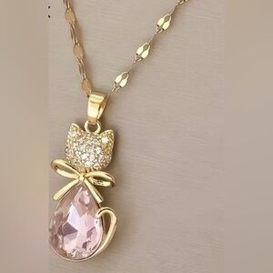 Gold Necklace with Pink Gemstone Cat Pendant. (Box not included)
