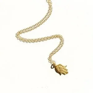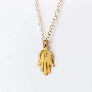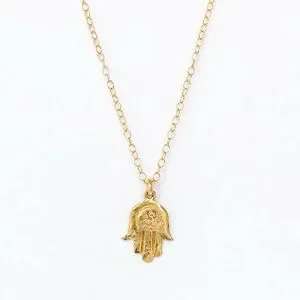 Brand new. Carved hamsa necklace with crescent moon and diamond in 14k yellow gold. Designed by Victoria Cunningham.