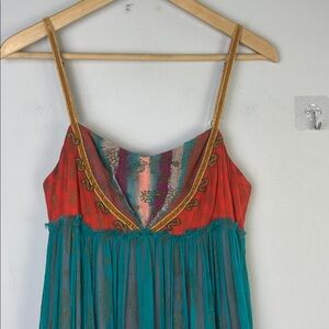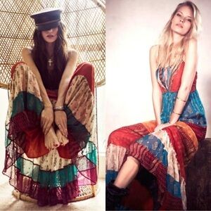 Free People Gilded Caravan Tiered Maxi Dress Size 4 Bohemian Velvet Straps Rare Flowy Gypsy Boho Summer Beach Vacaion Festival Hippie Rainbow Patchwork
