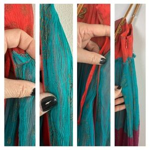 Extremely rare, Free People GILDED CARAVAN maxi dress. This does have a couple of very small flaws. Very minor and not noticeable when worn. They are right by the zipper. Please reference the photos. I didn’t know these tiny little holes were there until I was taking the photos under the bright lights. I wore it like this, and had no clue. The dress does have intentional fraying. Completely lined. Comes from a smoke free home. Original owner of this beautiful dress. Please use all the photos as part of the description. I am here and happy to help with any questions you have.