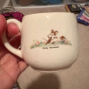Small white mug showing Katie Country Mouse on the front and Dicky Dormouse on back. Made in Beswrick, England. From the Fleetway Publications for Jack and Jill and Playhour Magazine. In excellent pristine condition without any chips or stains.