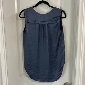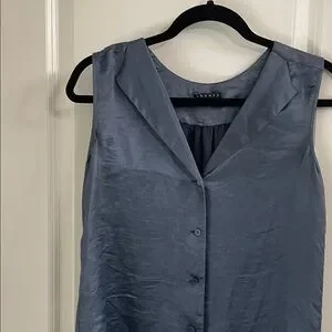 Chic navy blouse with button-down front. Sleeveless design for versatile styling. Perfect for work or casual outings.