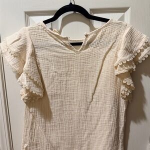 Chic cream blouse with textured fabric. Features lace trim on sleeves. Ideal for casual elegance.