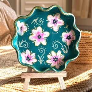 This is a cheerful trinket dish with a floral pattern. I made it from air-dry clay, painted it, and glazed it. The photos show the colors accurately, I’d say. I shared measurements in the photos.