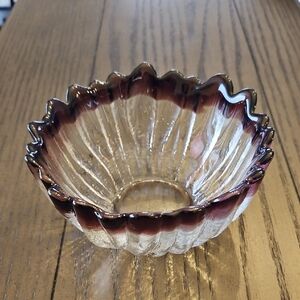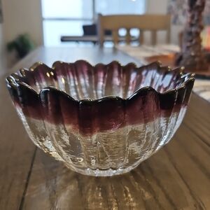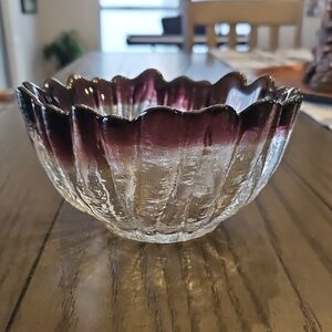 Beautiful vintage Humppila glass bowl with a wavy purple rim. It has a floral shape and mimics the appearance of natural ice. It is made in Finland and it is heavy in weight. Perfect to display on its own or to serve nuts/candy in. In great condition with no chips or cracks. Refer to photos.