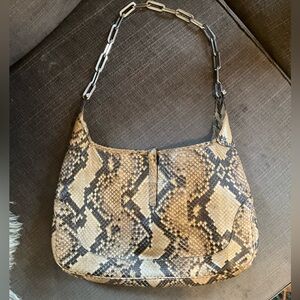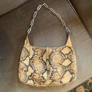 Vintage python Gucci Jackie 1961 bag with a silver chain handle. Tom Ford era. Corners & inside are good. Idk how, but I got something red on it in a few spots (see photos). Not super noticeable…looks worse in photos. This is a rare find. Iykyk.