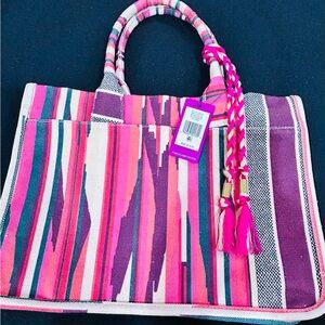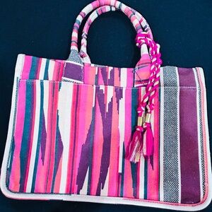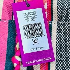 Brand new with tags Vince Camuto Orla Tote featuring a vibrant woven design in pink, purple, coral, teal, and cream tones. This structured tote offers sturdy woven top handles, a magnetic snap closure, and a roomy interior with slip pocket for easy organization. Finished with a braided tassel accent for a chic boho touch.