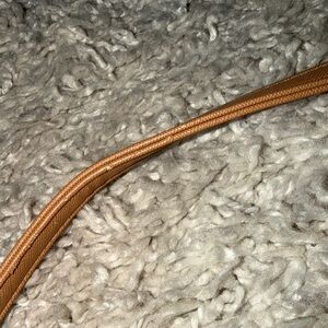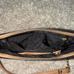 Stylish tan crossbody bag with a sleek design. Perfect for everyday use. Minor call outs on the strap and a minor black dot on the back of the bag