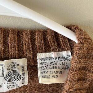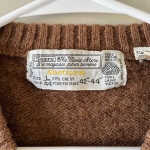 Vintage Sears Men's brown sweater vest. V-neck. Size Large (fits Chest 42-44). Shetland 100% Pure Virgin Wool. Made in Mauritius. Ribbed hem, arm holes and collar. In excellent, pre-loved condition. No flaws to note.