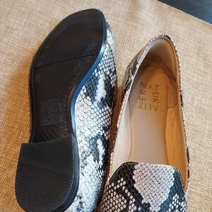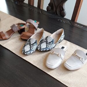 3 pair of size 8 shoes. A brown sandal by Italian Shoemakers, a snakeskin print loafer by Naturalizer, and an ivory slide mule loafer by Jones New York. These are comfortable and versatile shoes. Can be sold separately if you'd prefer. Just message me and I'll make a new listing.