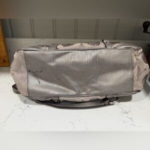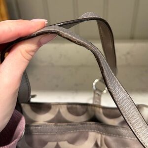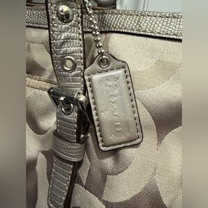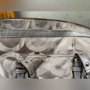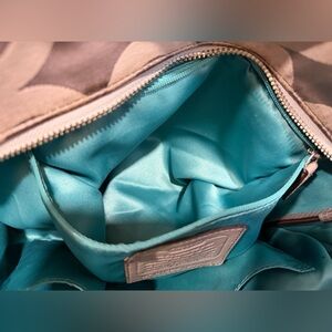 Coach Signature Shoulder Tote Bag. Beige/grey/silver with vintage monogram and turquoise/blue interior lining. Silvertone hardware. Has Coach bag tag. Vintage style bag. In very used condition. Would benefit from a cleaning in a new home. Needs cleaning shows wear. Stains visible. Comment with any questions! Always open to offers!