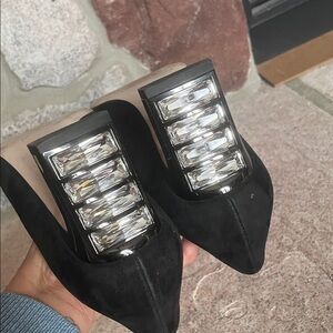 Chic black suede heels by Miu Miu. Perfect for elevating any outfit.