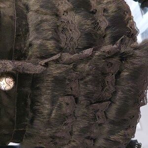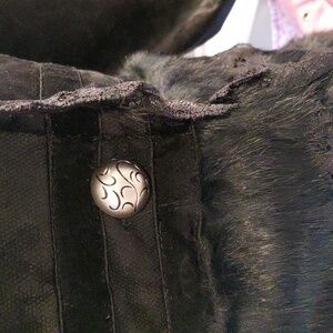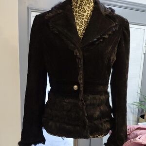 This elegant black women's jacket offers a sophisticated look for any occasion. Its sleek design and luxurious feel make it a must-have addition to your wardrobe.velvet with real fur fits size Medium. ptp20 inch
