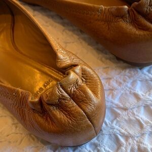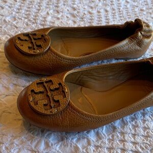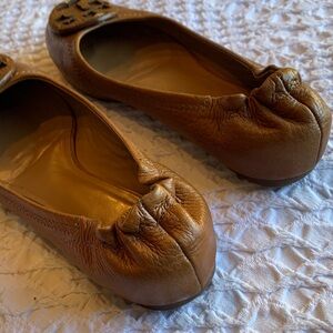 Elegant brown leather flats with signature Tory Burch logo. Perfect for versatile styling.