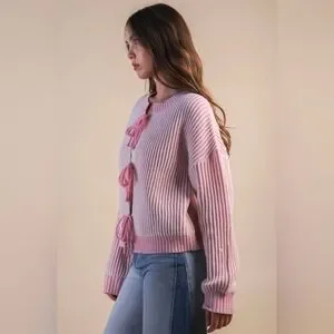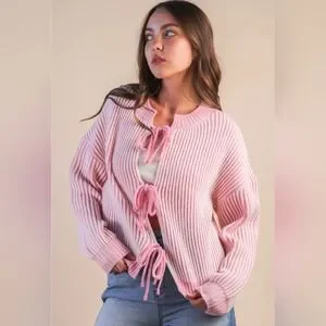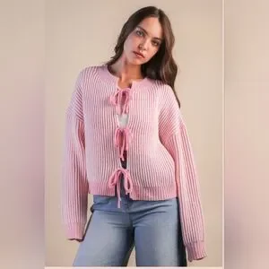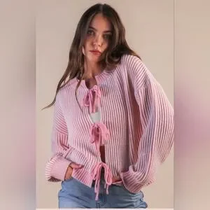 The Hearts Entwined Cardigan is a cozy knit designed with romance in every detail. Featuring a soft pink and white pinstripe pattern and delicate front tie bow closures, this cardigan brings a sweet, feminine charm to your everyday looks. With a relaxed drop-shoulder fit, long sleeves, and a ribbed hem, it’s perfect for layering while still feeling effortlessly chic. Whether styled casually or dressed up for Valentine season, this piece is love at first wear.