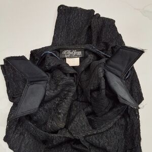 ~Long black lace dress, from the brand All that Jazz, sold at sears in the 90s, known for its affordable, trendy women's fashion. Featuring black buttons going up the front, and a ruffle collar neckline. This item is made from a Nylon and Rayon blend.