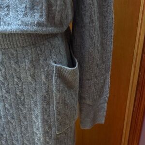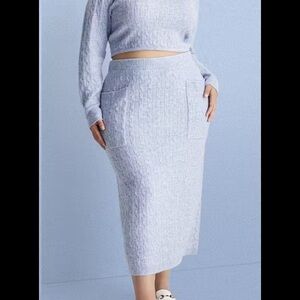 NWT cable knit sweater/skirt set from Future Collective. Long sleeve top has a scoop neck and cropped silhouette. Elastic waist straight skirt with front patch pockets. Soft, snuggly and stylish! Wear them together or separately. Super versatile! Light blue color. Size Large