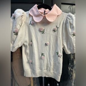 Adorable kids blouse with floral accents. Features a charming pink collar.