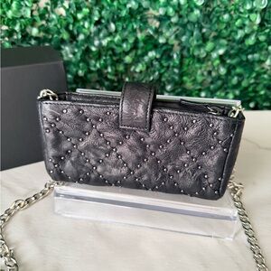 Chanel black quilted wallet with silver accents. Elegant and stylish design.