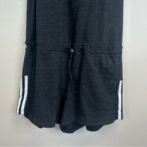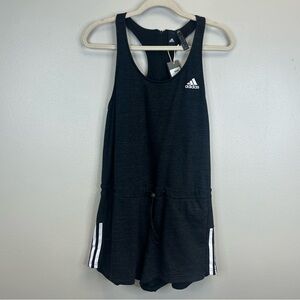 Charcoal sleeveless romper with iconic Adidas logo. Ideal for active wear. Womens size S. NWT. Drawstring elastic waist. Zipper closure on back.