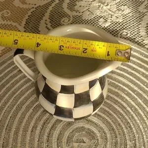 Charming metal creamer with classic black and white checks. Ideal for serving or display.