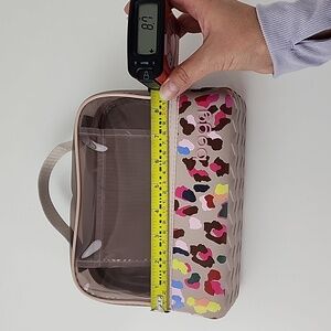 Condition: Rubbing/fading of print on right corner of bag, scratches on transparent topper, zipper indentions on transparent topper