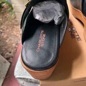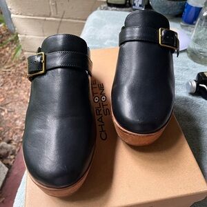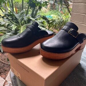 Elegant black leather vintage inspired mules with a sturdy wooden heel. Features a stylish buckle detail. Perfect for versatile wear. Work horse alert! If I wasn't overhauling my closet for a different color season I wouldn't be selling these! Have been worn a few times and lovingly cleaned, conditioned and stored in box after use. Cheaper on Depop! @dimesadozen