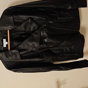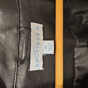 Women's Motto style jacket. size 3X. Black. Has stretch fabric detail on arms with button to detail at waist. In fabulous used condition. Only defect is split in fabric near the collar, see picture. Cool jacket! 🤩
