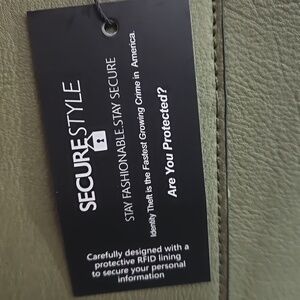 NWT. Faux leather, outside slip pocket, side zip pocket inside as well as 3 RFID card slots. Removable adjustable length shoulder strap.