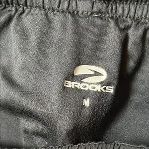 Brooks athletic shorts in black with gray side panels. Ideal for running and workouts. Item pre-owned. May have general signs of wear.